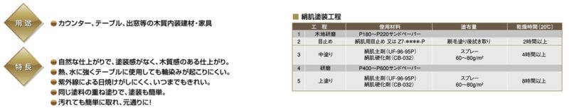 玄々化学工業株式会社の『ピュアEX絹肌(2液型ポリウレタン樹脂塗料)』は、テーブルなどの天板塗装はもちろん飲食店舗のカウンターや過酷な条件に晒される出窓などの木部塗装にもおすすめです。