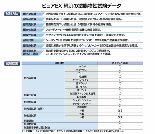 『ピュアEX絹肌(2液型ポリウレタン樹脂塗料)』は、熱・水に強い塗膜を作りテーブルやカウンターに輪染みなどのトラブルが起こりにくいだけでなく、日焼けにしにくく、防汚性も高い事が試験データからも証明されています。