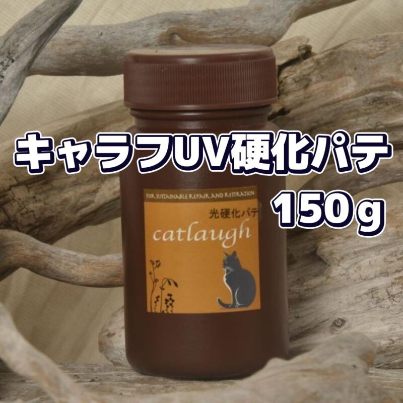 半透明(乳白色)タイプのキャラフ補修専用UV硬化パテ150gと『キャラフ補修専用UV硬化パテ大容量2kg』は、研磨性に優れており木部・アルミ・鉄・ステンレスなどほとんどの素材に密着する汎用性が高くコスパに優れたUV硬化パテです。